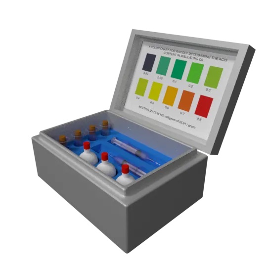Bộ kiểm tra độ axit được sử dụng để xác định độ axit của dầu cách điện máy biến áp. Nó bao gồm một chai polythene của dung dịch natri cacbonat, một chai polythene của tinh linh chỉnh lưu (rượu etylic) và một chai chỉ thị đa năng (chất lỏng). Bên cạnh đó, nó cũng bao gồm ống tiêm được chia tỷ lệ thể tích và ống nghiệm trong suốt và trong suốt.